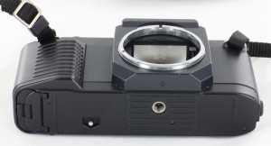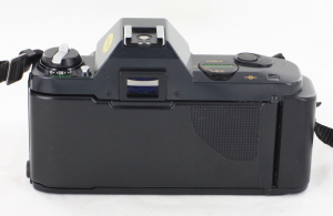 Canon T50, introduced in March 1983 and discontinued in December 1989, was the first in Canon's new T series of 35mm single-lens reflex cameras compatible with Canon's FD lens mount. SLR sales were falling in 1983 from the market's 1981 peak, and Canon chose to try greater automation to revive sales and remain competitive. This approach had found favor in compact cameras such as the AF35M "Autoboy" (Japan) or "Sure Shot" (US). The T50 had a power winder built in giving a continuous shooting rate of 1.4 frames per second, as well as an advanced auto-exposure mode, although it was still a manual focus camera. Unlike those compact cameras and the higher-end models in the T series, the T50 did not have power rewind, relying on a manual crank. The camera's electric systems were powered by two AA batteries in the grip, which gave enough power to shoot 75 24-exposure rolls, or 50 36-exposure rolls.