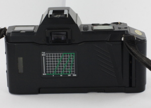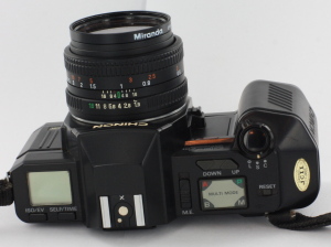 The Chinon CP-7m is an angular 35mm SLRintroduced by Chinon in about 1986, adding integral motorized film advance. It is also sold as the Revueflex AC 5. It offers aperture-priority autoexposure, or three programed modes when attached K mount lenses are set to their minimum aperture or the "A" setting.