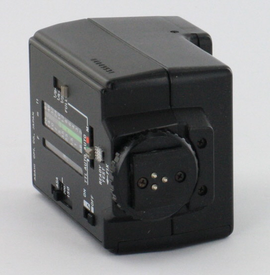 A comprehensive exposure table on the rear includes film speeds from ASA (ISO) 25 to 800, distances from 0.6 to 20m (2 to 65 feet) and apertures from f/1.4 to f/32. Ready light with test button provided. The flash is very nicely made, in Japan. A locking wheel allows the flash to be fixed tightly to the camera's hot shoe. It even has a serial number! The battery compartment has a proper hinge, and is captive so it can't be lost.