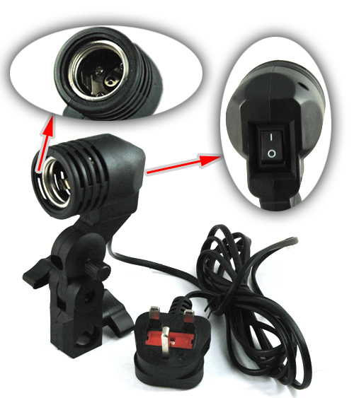 This bulb holder will accept screw fit bulbs takes an umbrella and will fit to any standard light stand spigot. It can be adjusted to any angle .
