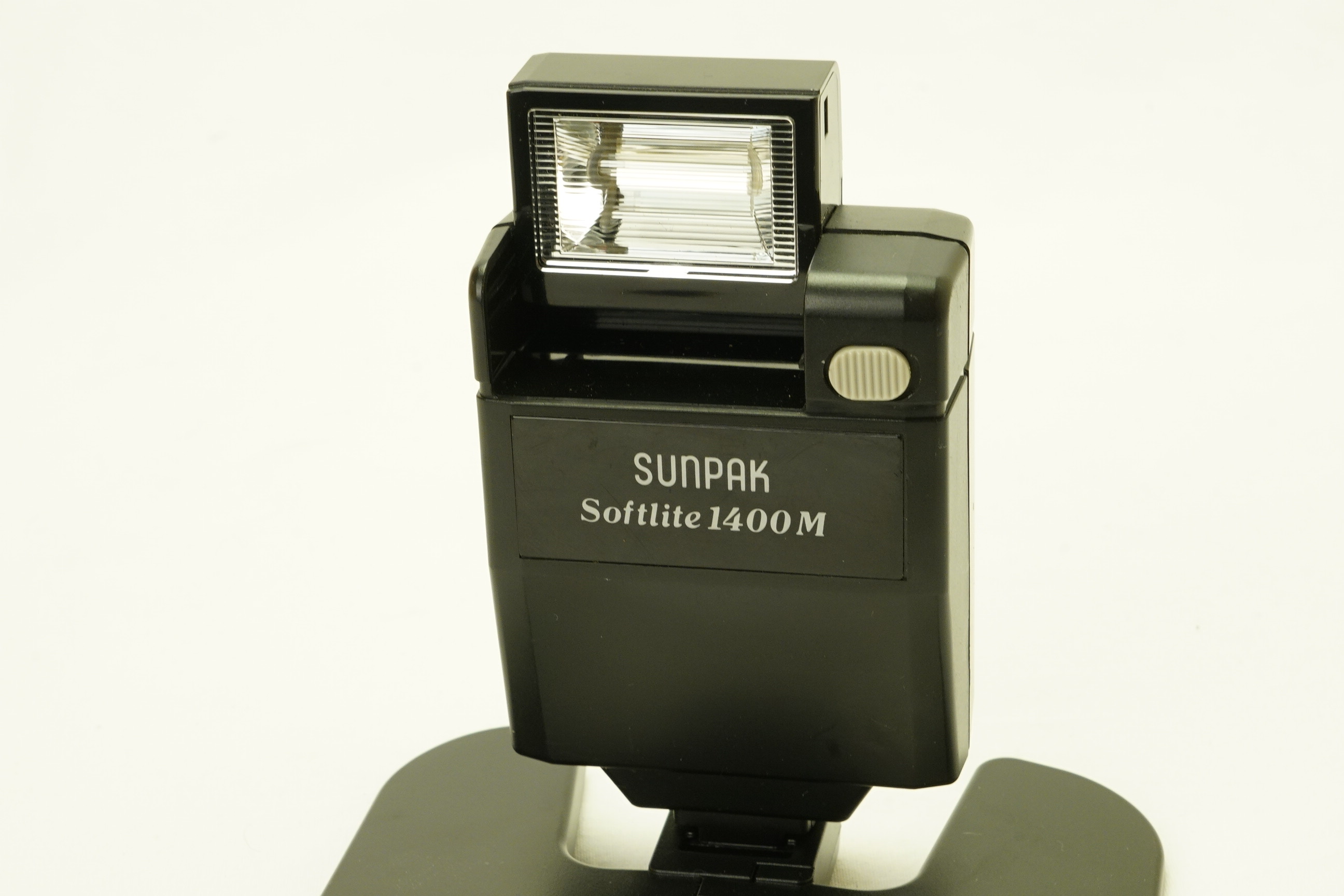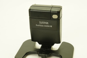 Sunpak Softlite 1400M Flip-up Hot-Shoe Mount Mini Electronic Flash Unit. For most hot-shoe film cameras. not included. Includes spec sheet, no box or case. Dimensions: 3 x 2.4 x 1.3 inches, weight 3-oz.